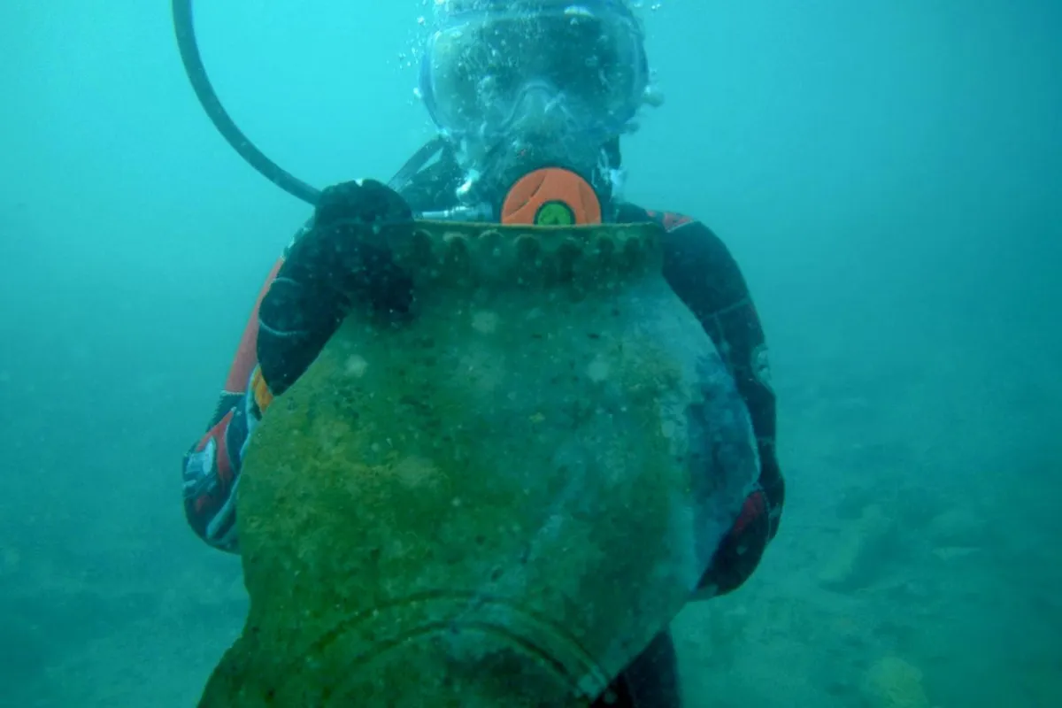 غواص با خمره قرون وسطایی از شهری گمشده در دستش، در اعماق دریاچه‌ای در قرقیزستان.