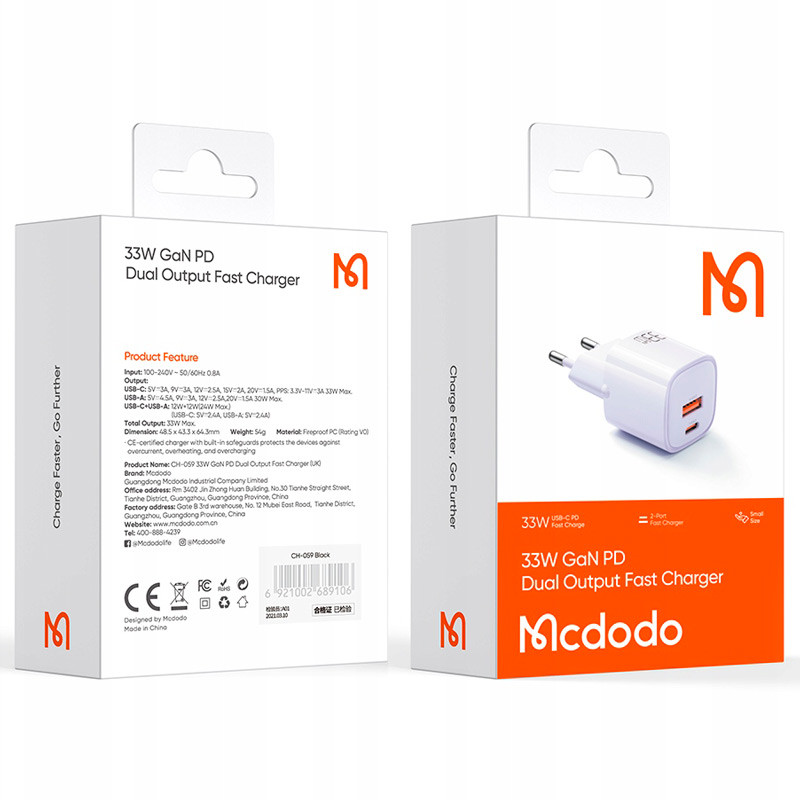 شارژر دیواری 33 وات مکدودو MCDODO Nano CH-015 یک شارژر قدرتمند، سریع و کاملاً بهروز است که با فناوریهای نوین GaN، VOOC، QC4.0 و PD3.0 طراحی شده تا گوشی، تبلت و گجتهای شما را در کوتاهترین زمان ممکن، با نهایت ایمنی شارژ کند. استفاده از تکنولوژی GaN باعث شده این شارژر با وجود توان بالا، کوچکتر، خنکتر و کارآمدتر از شارژرهای معمولی باشد.